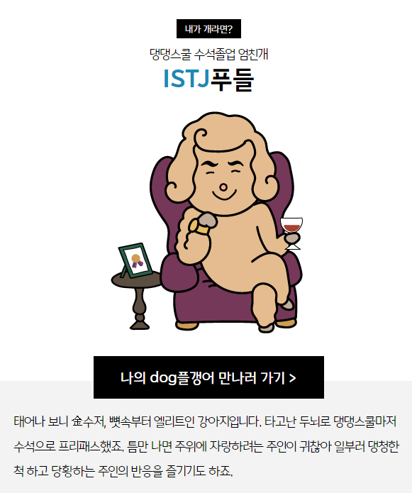 ISTJ는 푸들이래요. 댕댕스쿨의 수석졸업 엄친개. ㅎㅎㅎ 타고난 두뇌, 뼛속부터 엘리트인 강아지라고 하네요. 자랑질하는 주인이 귀찮아서 오히려 댕청한척하는 푸들입니다.