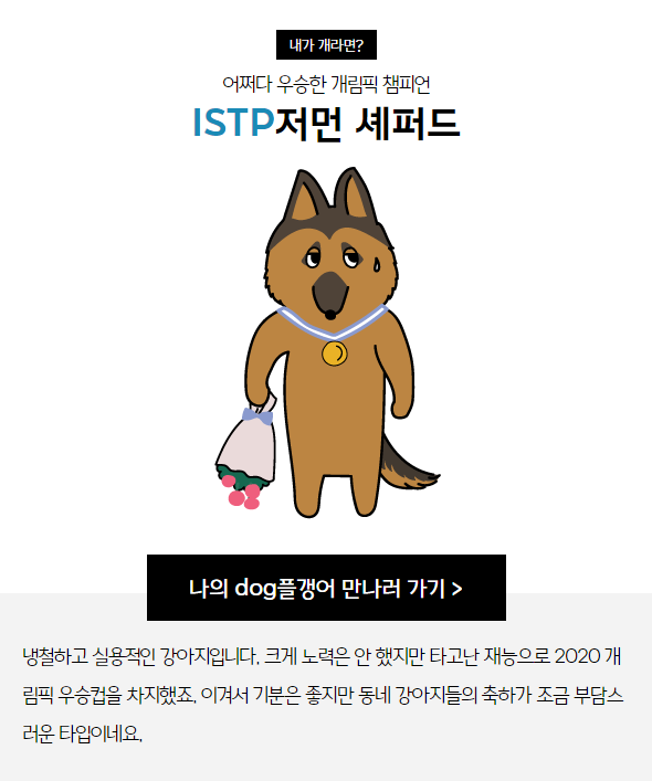 저는 저먼 셰퍼드가 나왔어요. ISTP인데, 저는 평소 INFP가 나오는 성격인데 조금 다르게 나왔네요. ㅎㅎㅎ