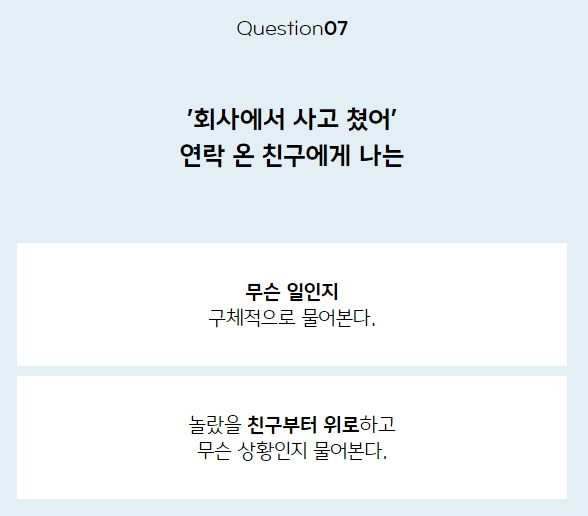 7. '회사에서 사고쳤어' 연락온 친구에게 나는? 무슨일인지 구체적으로 물어본다 / 놀랐을 친구부터 위로하고 무슨상황인지 물어본다