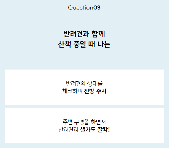 3. 반려견과 함께 산책중일 때 나는? 반려견의 상태를 체크하며 전방 주시 / 주변 구경을 하면서 반려견과 셀카도 찰칵!