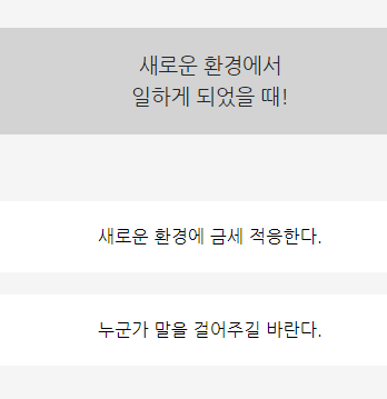 1. 새로운 환경에서 일하게 되었을때? 새로운 환경에 금새 적응한다/ 누군가 말을 걸어주길 바란다.