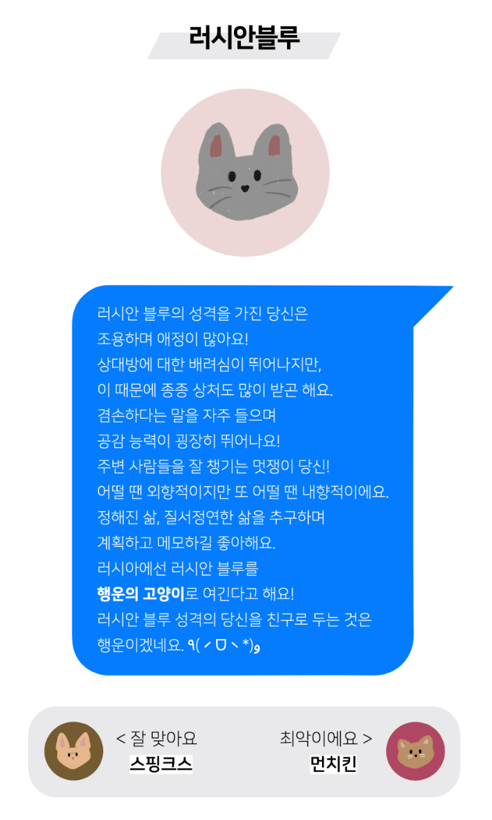 제 고양이 테스트결과는 '러시안블루'가 나왔어요.