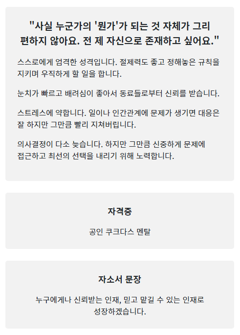 쿠크다스 멘탈 자격증을 가진 만큼 멘탈이 와르르 무너질 수 있으니 주의해야겠네요. 인생의 명대사 MBTI는 꿈날개에서 개발한 성격테스트로 자소서 문장까지 추천해주네요 ㅎㅎㅎ '누구에게나 신뢰받는 인재, 믿고 맡길 수 있는 인재로 성장하겠습니다'라는 문구, 꼭 기억할게요.