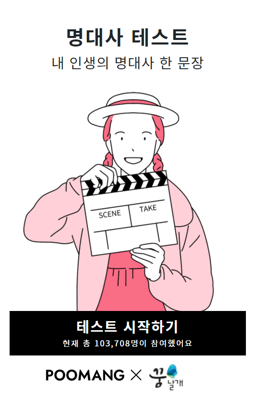 내 성격과 찰떡으로 맞는 영화의 캐릭터를 찾아주고, 그들의 명대사를 알아보는 MBTI 테스트입니다. 내 마음을 울린 영화 캐릭터의 명대사가 있으신가요? 마음에 염두해두고 출발해봅시다!