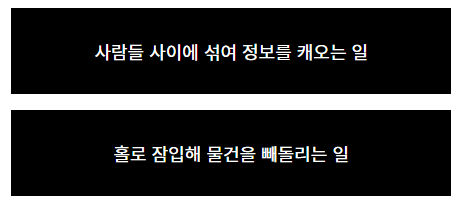 사람들사이에 섞여 정보를 캐오는 일 / 홀로 잡입해 물건을 빼돌리는 일