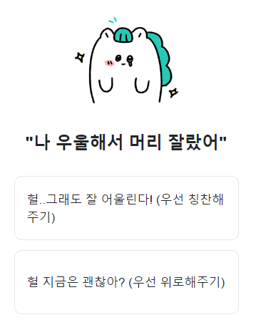09. 친구가 '나 우울해서 머리잘랐어'라고 하면? 우선 잘 어울린다고 칭찬해주기 / 우선 위로해주기