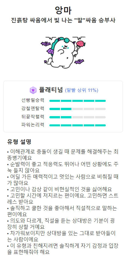 솔직하고 쿨한 타입인 '앙마'와 싸우는 일은 없었으면 좋겠네요. 말이 직설적이라 듣는 상대방이 기분나쁠수 있지만, 나쁜 의도는 없는 경우가 많다고 하네요.