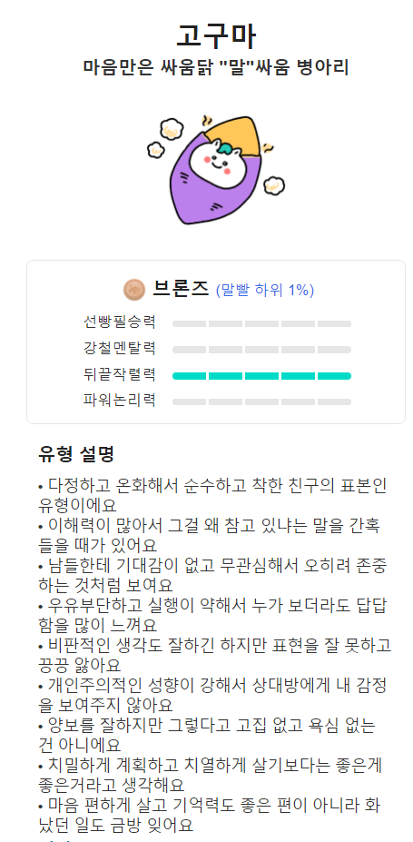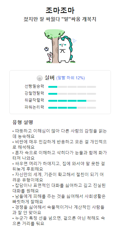 완전 잘 맞아서 소름끼쳐요!! 저는 INFP인데 실제로 말싸움도 INFP가 나왔네요. 인프피는 말싸움 개복치로, 말싸움만 하면 지는 타입 ㅎㅎㅎ 말싸움 전투력 서열표에 따르면 실버등급이네요.