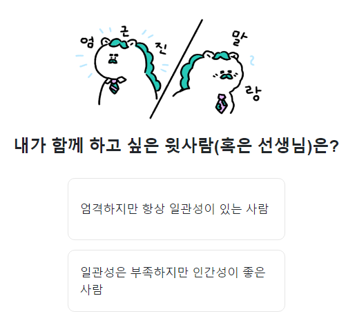 10. 내가 함께 하고 싶은 윗사람은? 엄격하지만 일관성있는사람 / 일관성은 없지만 인간성이 좋은 사람