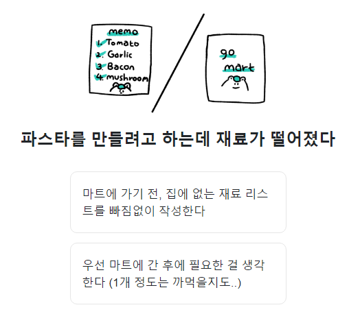 07. 파스타를 만들때 재료가 떨어졌다면? 재료리스트 들고 마트로 / 마트간 후 필요한걸 생각