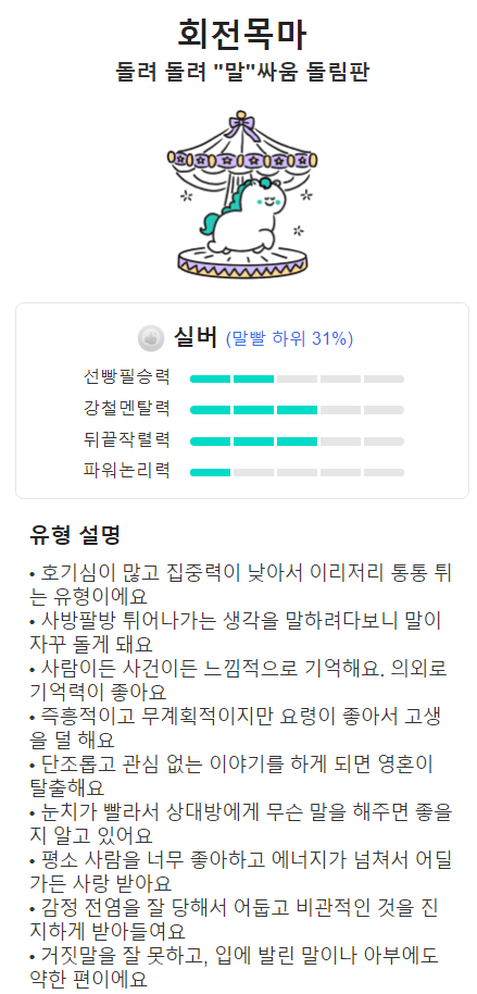 10위까지는 그래도 상위권이라고 한다면 11위부터는 말싸움 전투력 하위권에 해당합니다. 회전목마타입은 산만한 성격탓에 논리적인 말싸움에 매우 약한편인데요. 그래도 끊임없이 반박하는 말로 상대를 지치게 할 수 있습니다.