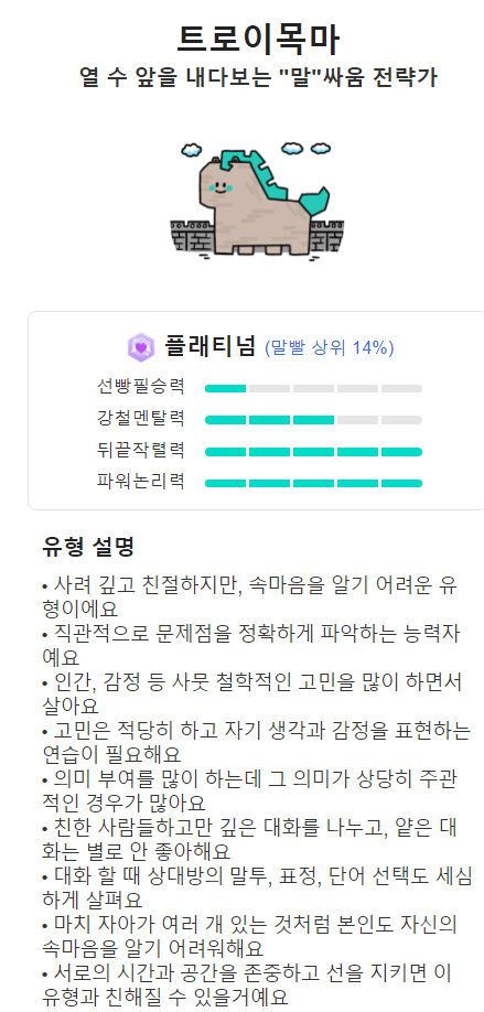 자신의 마음을 잘 내비치지않는 트로이목마는 굉장히 문제점을 정확하게 파악하기 때문에 뼈때리는 팩폭을 맞을 수 있습니다. 내적성향 중에서 가장 말빨이 센 타입.