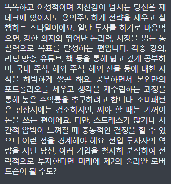 호랑이 투자성향을 가진 사람은 매우 이성적이기 때문에 전략을 철저히 세우고 실행하는 스타일이래요. 넓고 깊게 공부하고, 해박한 지식을 쌓으며 일단 투자하기로 마음먹으면 강한 의자로 뛰어난 통찰력으로 높은 수익을 달성한다고 하네요. 너무 좋은거 아닌가요??