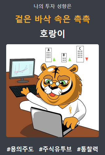 저는 겉은 바삭 속은 촉촉한 '호랑이'가 나왔어요. 해시태그로 '용의주도', '주식유투브', '통찰력'이 나왔는데, 내 투자성향을 과대평가하고 있군.....ㅋ