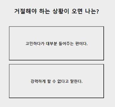 7. 거절해야 하는 상황에 난? 고민하다가 대부분 들어준다 / 강력하게 할수 없다고 말한다
