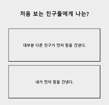 1. 처음 보는 친구들에게 나는? 대부분 다른 친구가 먼저 말을 건다 / 내가 먼저 말을 건다.