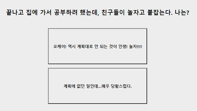 11. 집에가서 공부하려는데 친구들이 놀자고 한다면? 논다 / 매우 당황스럽다