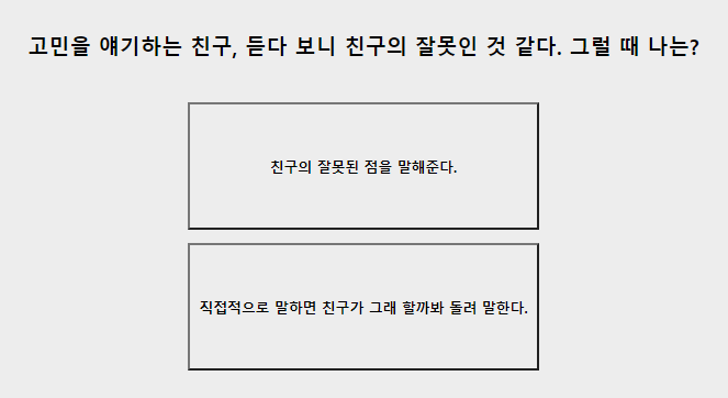 9. 고민을 얘기하는 친구, 듣다보니 친구잘못인것 같다. 그럴때 나는? 친구의 잘못을 말해준다 / 돌려 말한다.