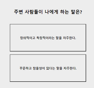 6. 주변 사람들이 나에게 하는 말? 창의적이고 독창적이다 / 꾸준하고 참을성 있다