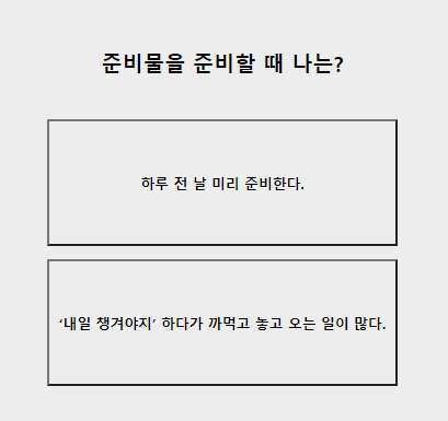 10. 준비물을 준비할때? 하루전날 미리 준비 / 내일챙겨야지 하다가 까먹는다