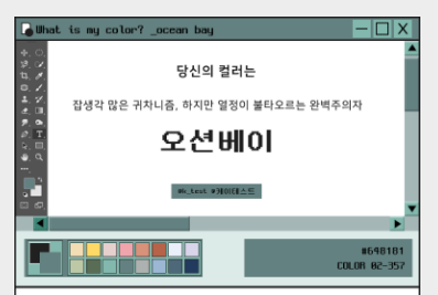 오션베이 컬러를 가진 사람은 잡생각이 많은 귀차니즘이래요. 그렇지만 열정이 불타오르는 완벽주의자! 우와.. 정말 찰떡! 몸뚱이는 게을러터졌는데 완벽을 추구하죠. ㅎㅎㅎ