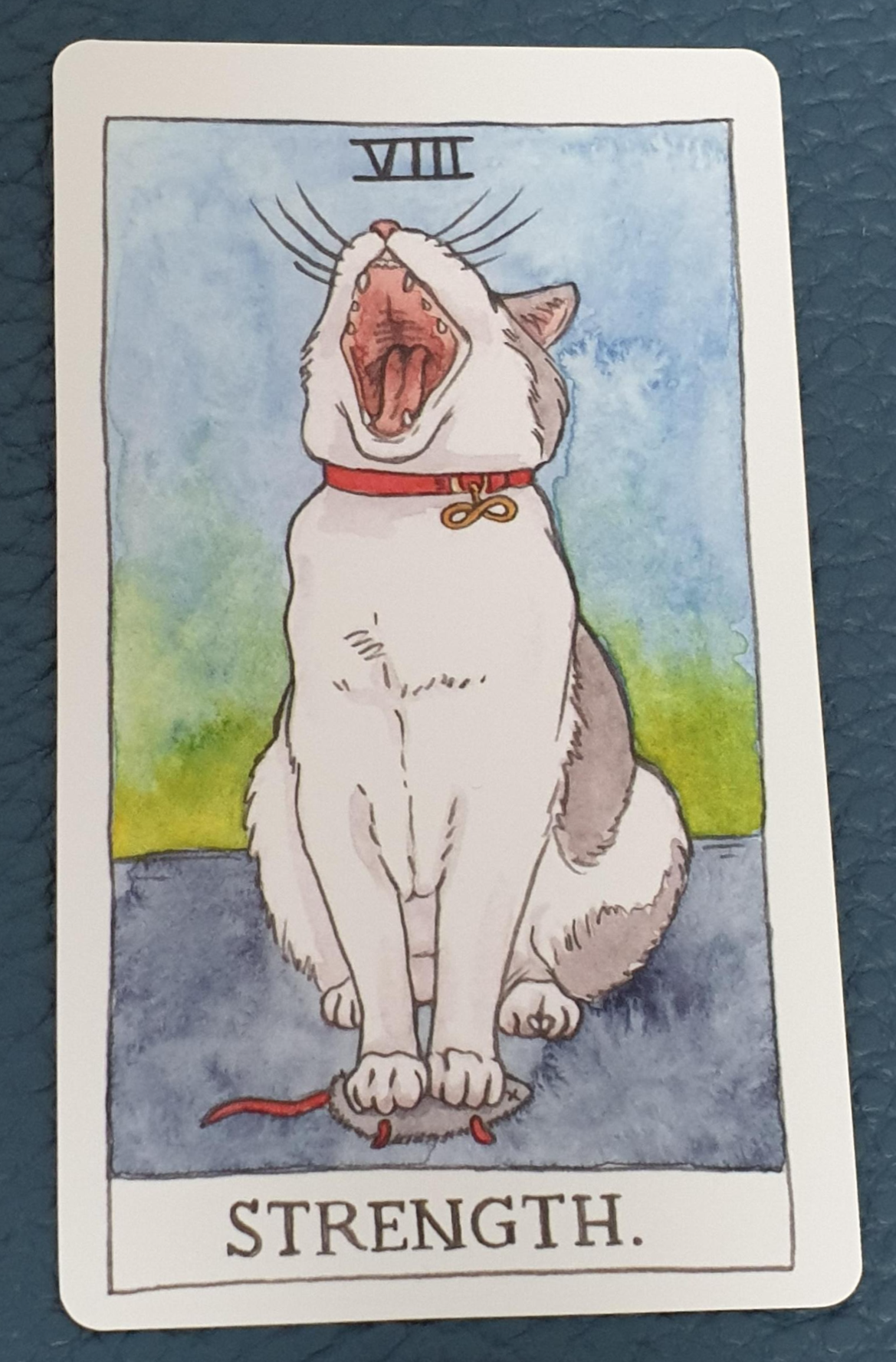 3번은 힘 카드가 나왔습니다. 두 앞발로 쥐를 단단히 잡은채 포효를 하는 것인지 하품을 하는 것인지 입을 쩍 벌리고 있는 고양이의 모습인데요. 고양이의 목에는 무한을 상징하는 목걸이가 걸려있습니다.