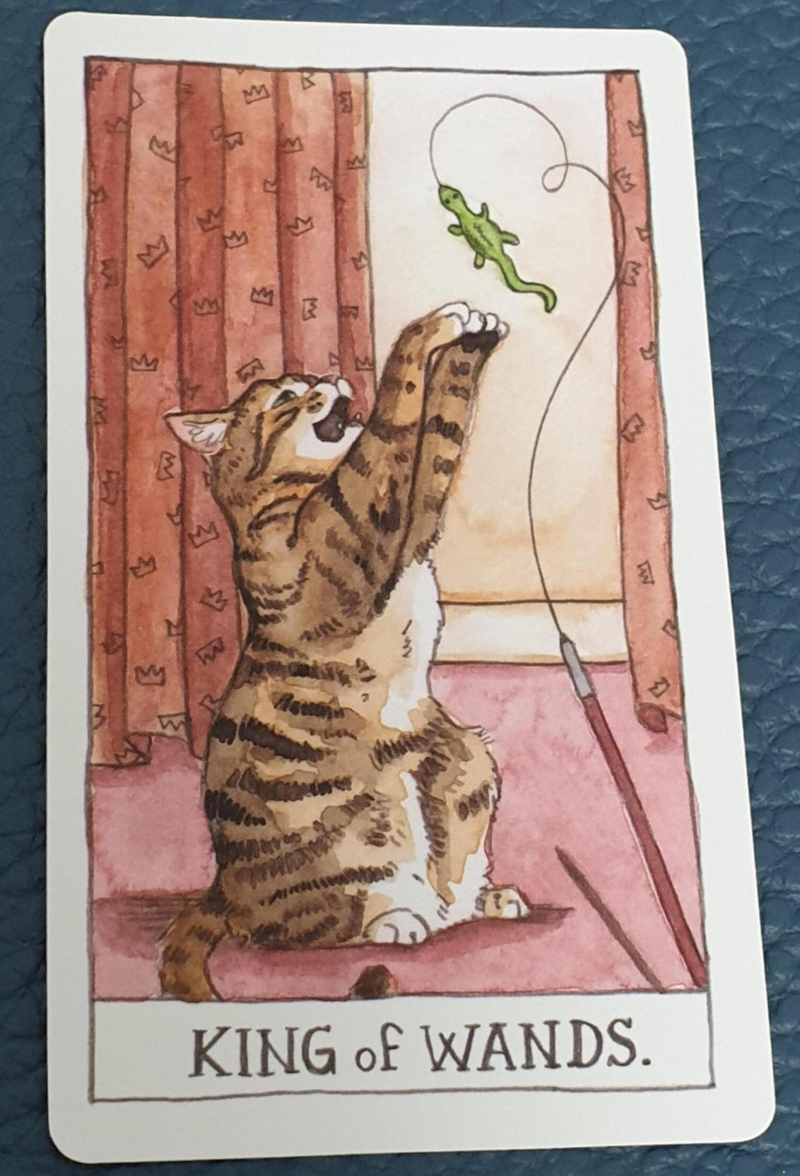 완드카드는 불을 상징하는 카드로 위로 타오르는 불꽃이나 위로 뻗어 올라가는 나무입니다. 바로 성장, 에너지와 아주 밀접한 관련이 있는데요. 그림속의 고양이는 낚시장난감 끝에 달려있는 도마뱀을 향해 앞발을 쳐들고 있습니다.