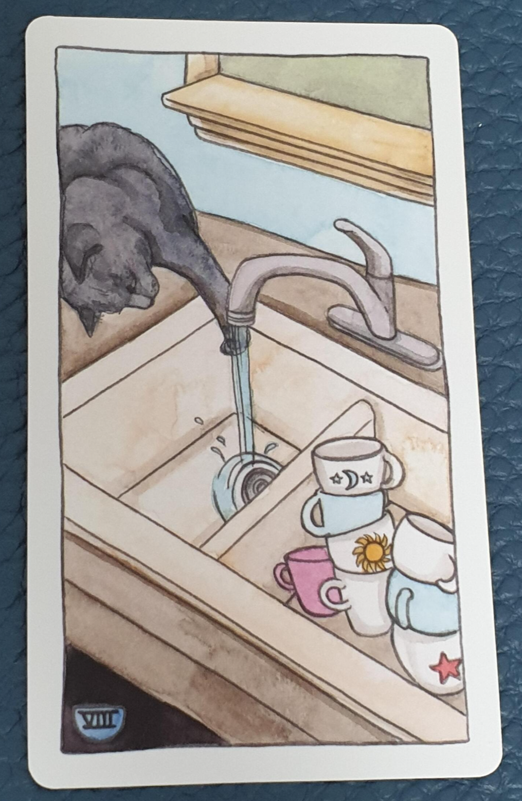 4번카드는 8개의 컵 카드가 나왔습니다. 그림 속에 고양이는 씽크대에서 흐르는 물에 앞발을 적시고 있는데요. 한쪽에는 해, 별, 달이 그려진 컵들이 쌓여있습니다.