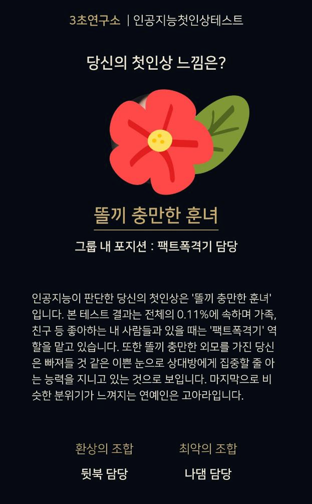 그룹 내 포지션은 팩트폭격기래요. 전체의 0.11%에 속하며, 좋아하는 사람들과 있을때 '팩트폭격기' 역할을 맡고 있습니다. 또한 똘끼 충만한 외모를 가진 당신은 빠져들것 같은 이쁜 눈으로 상대방에게 집중할 줄 아는 능력을 지니고 있는 것으로 보입니다. 비슷한 분위기의 연예인은 '고아라'라고 합니다.