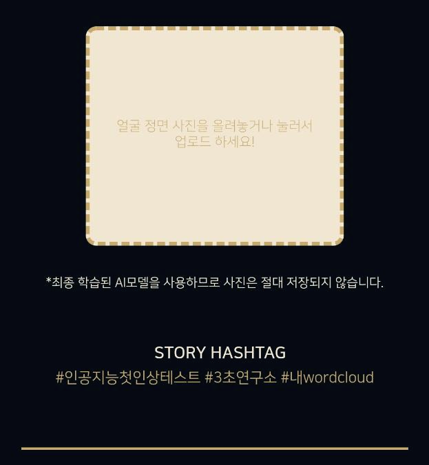 사이트로 이동하면 심플한 화면이 뜨는데요. 얼굴 정면사진을 갤러리에서 선택하여 첨부하면 됩니다. 사진은 절대 저장되지 않는다고 명시해 놓았으니, 믿고 첨부해보겠습니다.