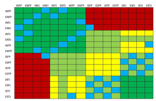 빨간구간은 나쁜 궁합, 파란구간은 좋은 궁합을 나타냅니다. INFP들과 가장 좋은 궁합을 나타내는 성격유형은 바로 ENFJ와 ENFJ인데요.