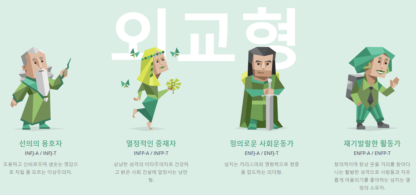 외교형으로 불리는 성격유형으로는 INFJ-A (또는 INFJ-T), INFP-A (또는 INFP-T), ENFJ-A (또는 ENFJ-T), ENFP-A (ENFP-T) 가 있습니다.