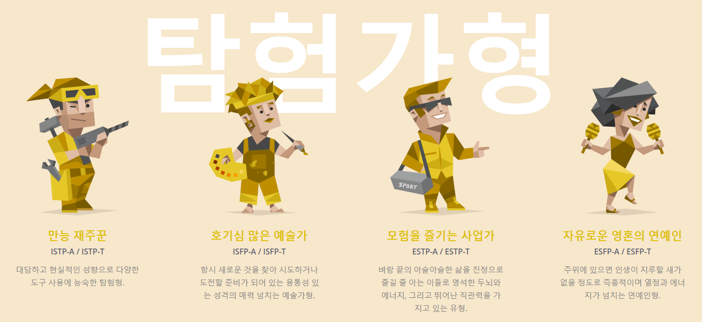 탐험가형으로 불리는 성격유형은 ISTP-A (또는 ISTP-T), ISFP-A (또는 ISFP-T), ESTP-A (또는 ESTP-T), ESFP-A (또는 ESFP-T) 가 있습니다.