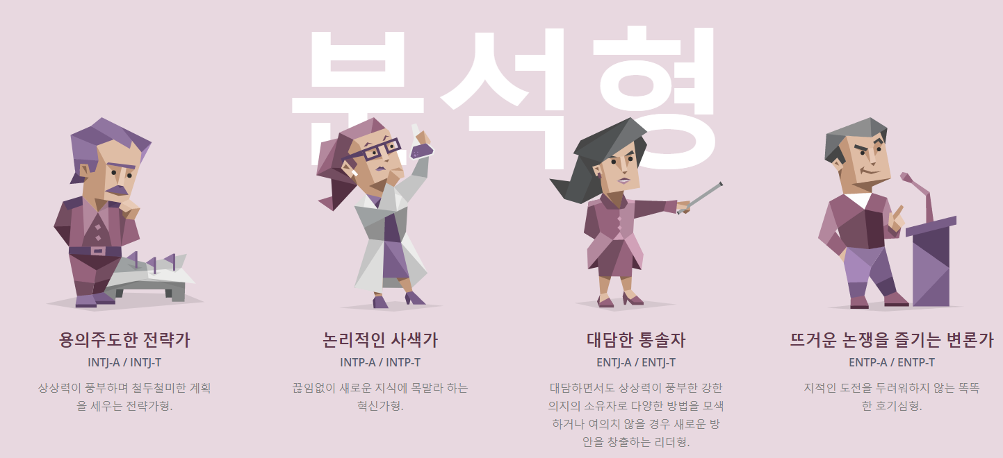 이들은 새로운 지식에 매우 예민하며 분석하기를 좋아하는 성격유형들인데 그 성격의 발현이 조금씩 다릅니다. I로 시작하는 유형들이 계획과 분석을 좋아하는데 반해, E로 시작하는 유형들은 새로운 방안을 창출하고 모험을 좋아하지요.